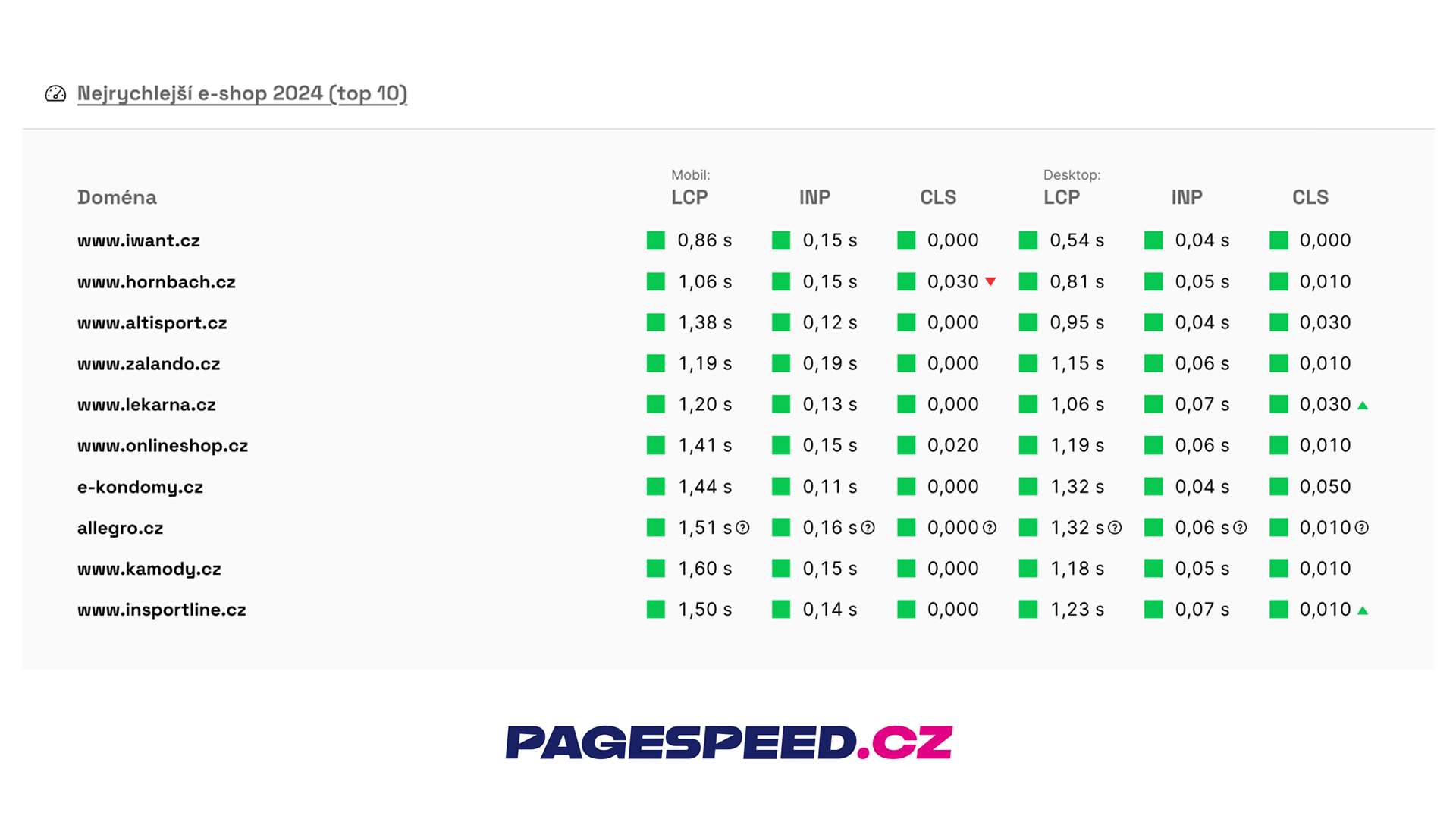 Mimochodem Smarty.cz, sesterský e-shop této rodiny, skončil hned na druhém místě. Výsledky obou jsou vynikající. Na mobilech zde vidíme 75. percentil pro rychlost načtení (metrika LCP) pod jednu vteřinu (0,93 s pro iWant.cz, 0,87 s pro Smarty.cz), nulové nechtěné posuny layoutu (metrika CLS) a odezvu na interakce (INP) v limitu. Skvělá práce!