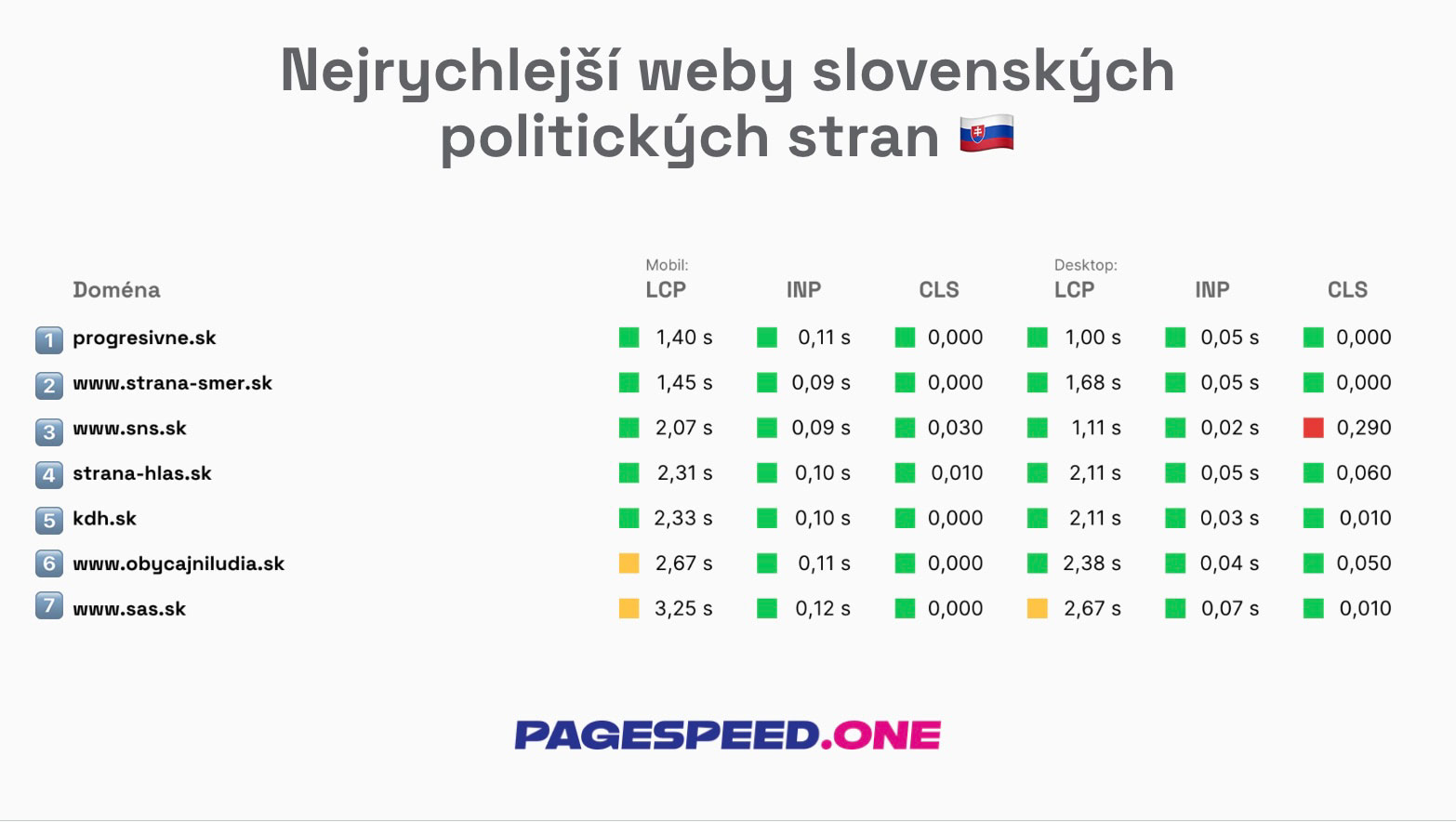 Na Slovensku jsou nejrychlejší weby progresivne.sk a strana-smer.sk, oba kolem 1,4 s.