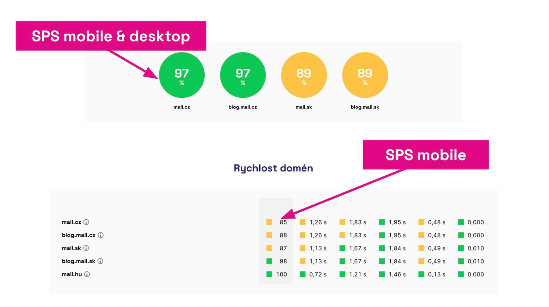 V případě, že se pustíte do optimalizací, zaměření na tyto konkrétní metriky by mělo být hned prvním krokem. Zároveň platí, že v hodnotě metriky SPS neuvidíte, jak Google hodnotí rychlost vašich domén nebo stránek.