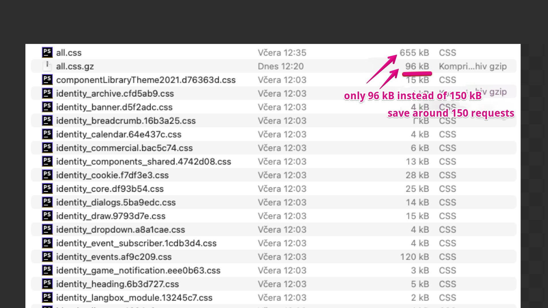Na webu Livesportu, konkrétně na stránce Fortuna liga, bylo v době testů 55 malých CSS souborů s celkovou velikostí 789 kB. S využitím komprese Gzip během přenosu je pak do prohlížeče přeneseno 156 kB.